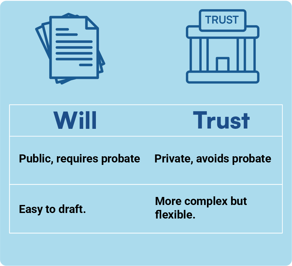 - Probate Process: Wills require court validation (probate), which can be public and time-consuming.